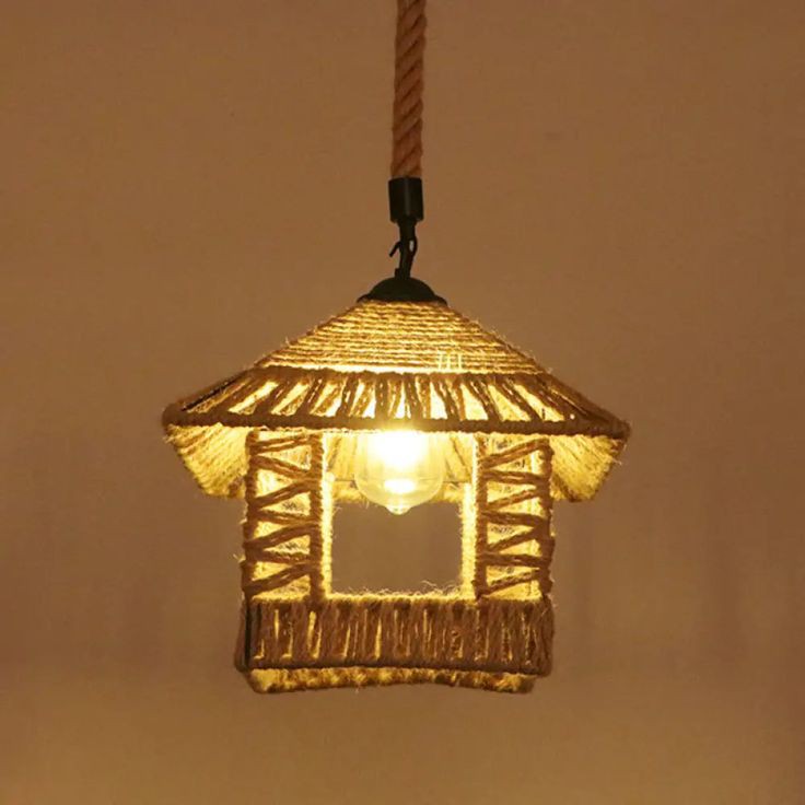 Add character to your space with this vintage-inspired pendant light, featuring a sturdy iron house-shaped frame wrapped in flexible hemp rope. The bendable rope allows for a customizable look, making it a unique statement piece.