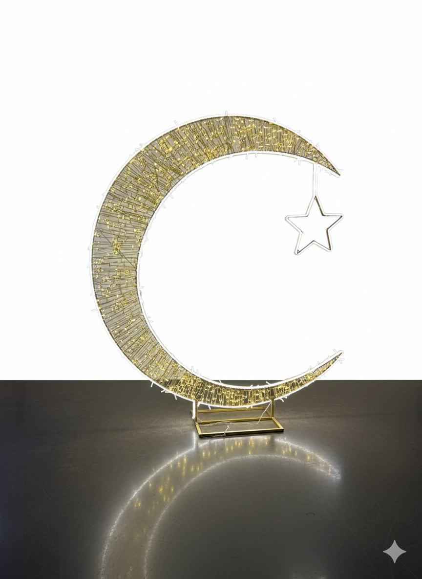Elevate your spiritual celebrations with our Luxury LED Crescent Moon and Star Sculpture. Masterfully crafted to serve as a breathtaking centerpiece, this floor-standing light feature blends traditional Islamic symbolism with sleek, modern design.