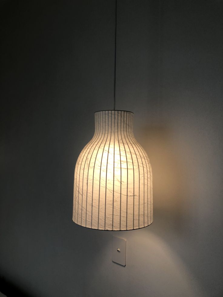 Materials: Cocoon resin shade, steel internal structure, plastic cord